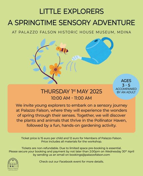 We invite young explorers to embark on a sensory journey at Palazzo Falson, where they will experience the wonders of spring through their senses. Together, we will discover the plants and animals that thrive in the Pollinator Haven, followed by a fun, hands-on gardening activity.